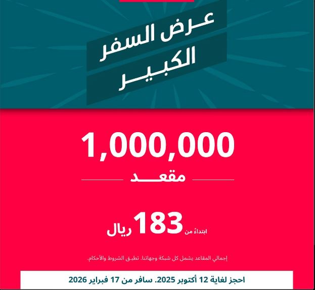 ويأتي هذا العرض تحت مسمى "عرض السفر الكبير"، ويمنح العملاء فرصة حجز مليون مقعد بأسعار تبدأ من 183 ريال فقط.